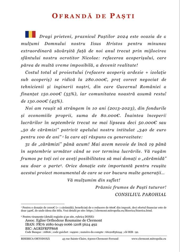 Dragi prieteni, biserica noastră din Clermont, amenajată la interior în 2012-2013 și la exterior în 2015-2016, trece acum prin ultima etapă de restaurare: Renovăm acoperișul.