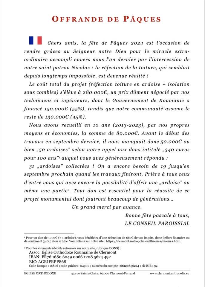 Dragi prieteni, biserica noastră din Clermont, amenajată la interior în 2012-2013 și la exterior în 2015-2016, trece acum prin ultima etapă de restaurare: Renovăm acoperișul.