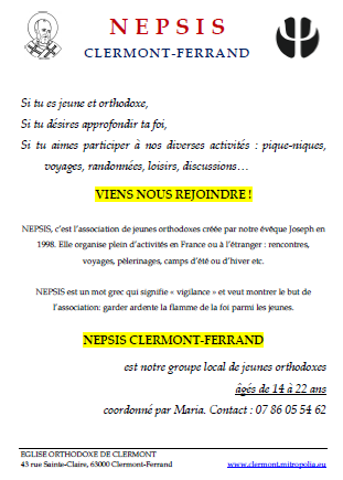 NEPSIS CLERMONT-FERRAND este grupul nostru local de tineri ortodocși cu vârsta cuprinsă între 14-22 de ani, coordonat de Maria. Contact : 07 86 05 54 62