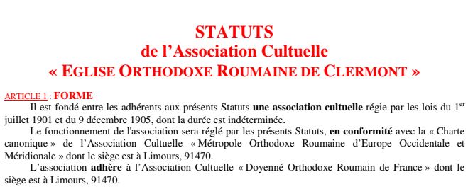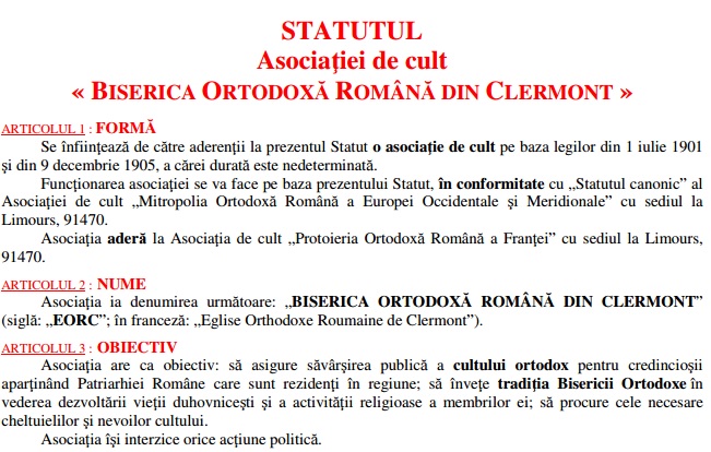 Conform legislației franceze, Parohia se organizează ca asociație de cult (Legea 1905) pe baza statutului de mai jos, votat la 15.10.2015 (înființarea comunității) și actualizat la 09.09.2012 (cumpărarea bisericii), depus la Prefectura din Clermont-Ferrand.